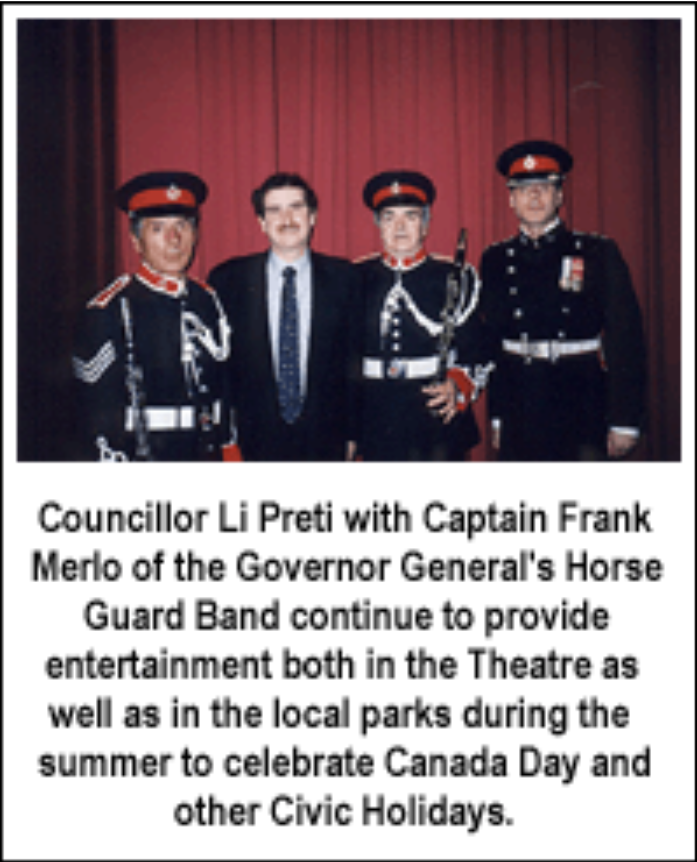 Among the passions which Peter enjoys and avidly supports are ‘the arts’. This is manifested in his efforts to have a Performing Arts Theatre created at Yorkwoods Library. The Theatre has also become the venue for the yearly classical concert series performed by Downsview Orchestra, as well as performance space for theatre groups and choirs. In 1986, Councillor Li Preti and Maestro Pietro Drago, began an orchestra to celebrate various artists such as the Centennary of Giuseppe Verdi, Rossini and other classical artists. Councillor Li Preti is a proud sponsor of young emerging artists from diverse Cultural backgrounds. Music from the Philippines, Latin America and the Caribbean have been featured under the auspices of Councillor Li Preti.