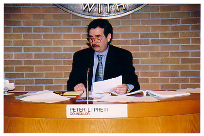Councillor Li Preti was the first North York Community Council Chair. In his maiden speech, he stressed the fact that portable and permanent signs were visually polluting the city and as a result he asked staff to monitor and reduce the number of permits approved for signs. In addition, he also indicated that massage parlours were an unwanted intrusion into the community with obvious negative repercussions. He requested the bylaw enforcement department to investigate and charge illegal operators.